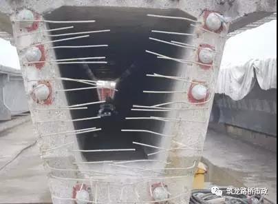 1) 箱梁預(yù)制時(shí)應(yīng)將伸縮縫預(yù)埋筋、泄水孔、防撞護(hù)欄預(yù)埋筋、吊梁孔(環(huán))、鋼束孔道等設(shè)計(jì)要求的預(yù)埋件全部按位置準(zhǔn)確裝好。